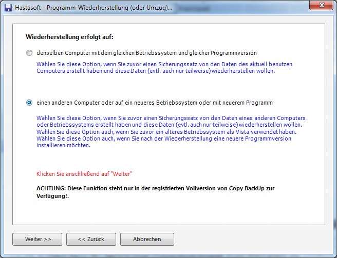 ![]() Im Menü "Extras" können Sie den Befehl "Hastasoft Programm-Wiederherstellung" aufrufen. Allerdings nur, wenn Sie Copy Backup mit Administrationsrechten ausführen. Diese werden nämlich benötigt, weil Copy Backup Daten in das Programmverzeichnis kopieren muss. Wenn Sie also Copy Backup unter Vista oder einem neueren Betriebssystem ausführen, wählen Sie unter Menü "Extras" den Befehl "Copy Backup mit Admin-Rechten starten" aus. Wenn Sie dann den obengezeigten Dialog aufrufen, wählen Sie zunächst, wie die Daten zurückgesichert werden sollen. Die einfachste Variante ist der erste Fall, wenn Sie also das Programm zuvor auf den gleichen Computer verwendet haben und sich die Art des Betriebssystems nicht verändert hat. Etwas komplexer ist es, wenn Sie ein Hastasoft-Programm z.B. vorher