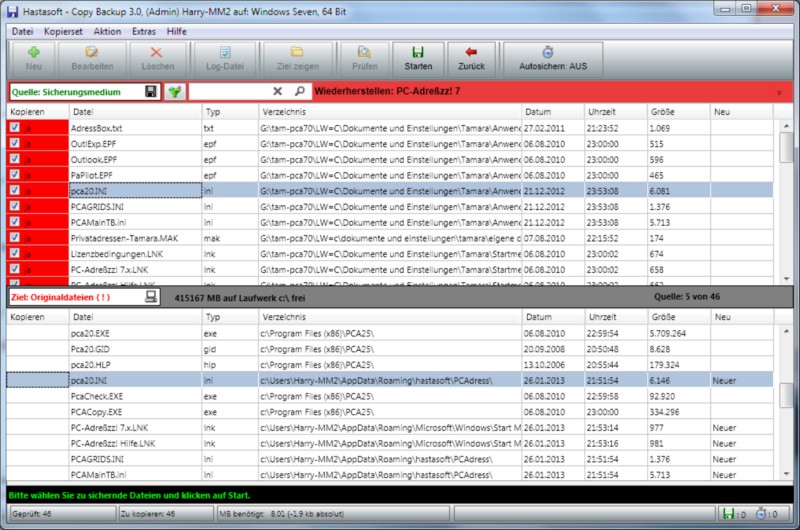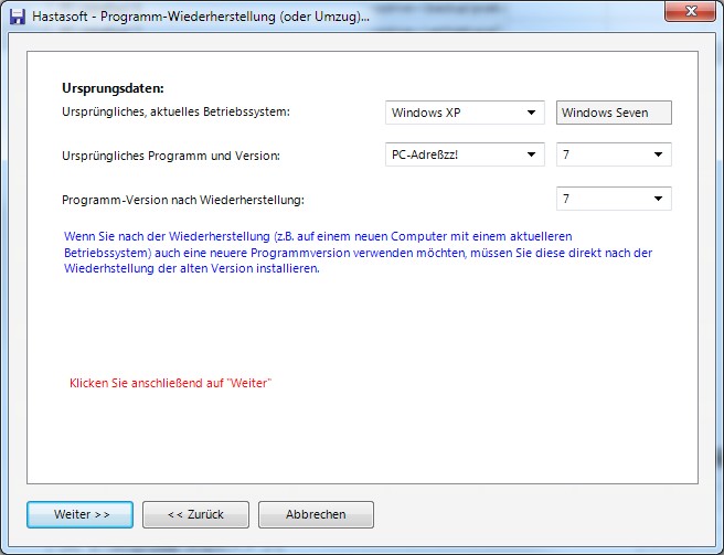 ![]() Hier kann man z.B. erkennen, dass PC-Adreßzz! 7, welches zuvor unter Windows XP verwendet wurde, nun unter Windows 7 weiterverwendet werden soll. Unter Windows XP existieren ganz andere Programm- und Programmdaten- Verzeichnisse, als unter Vista oder neueren Betriebssystemen. Hier zu wissen, wo welche Daten zu finden sind und wo man diese dann im neuen Betriebssystem hin kopieren muss, ist wahrlich eine echte Herausforderung, selbst für Computer-Profis. Copy Backup nimmt Ihnen die ganze Arbeit ab und speichert die Daten direkt in die richtigen Verzeichnisse, legt sogar Start-Menü-Einträge im neuen Betriebssystem an, damit Sie das Programm bequem aufrufen können.