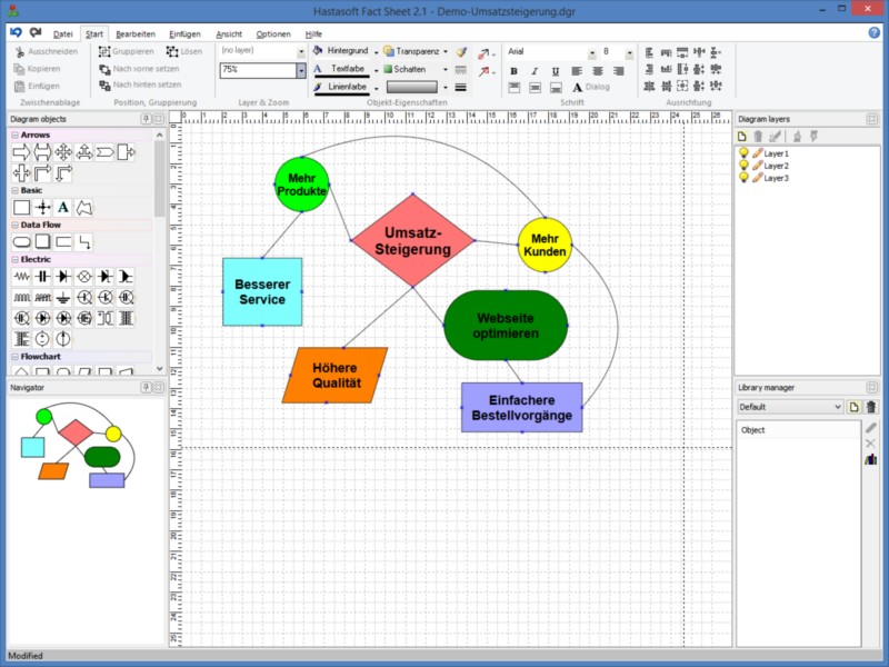 Fact-Sheet ist ein intuitiv zu bedienendes Programm, mit dem Sie Datenblätter (fact-sheets) von Sachverhalten erstellen können. Durch die grafische Darstellung haben Sie die benötigten Informationen schneller zur Hand, als mit irgendwelchen Textdokumenten. Natürlich können Sie auch einfache Diagramme, Organigramme, Ablaufpläne oder Mindmaps  erzeugen.